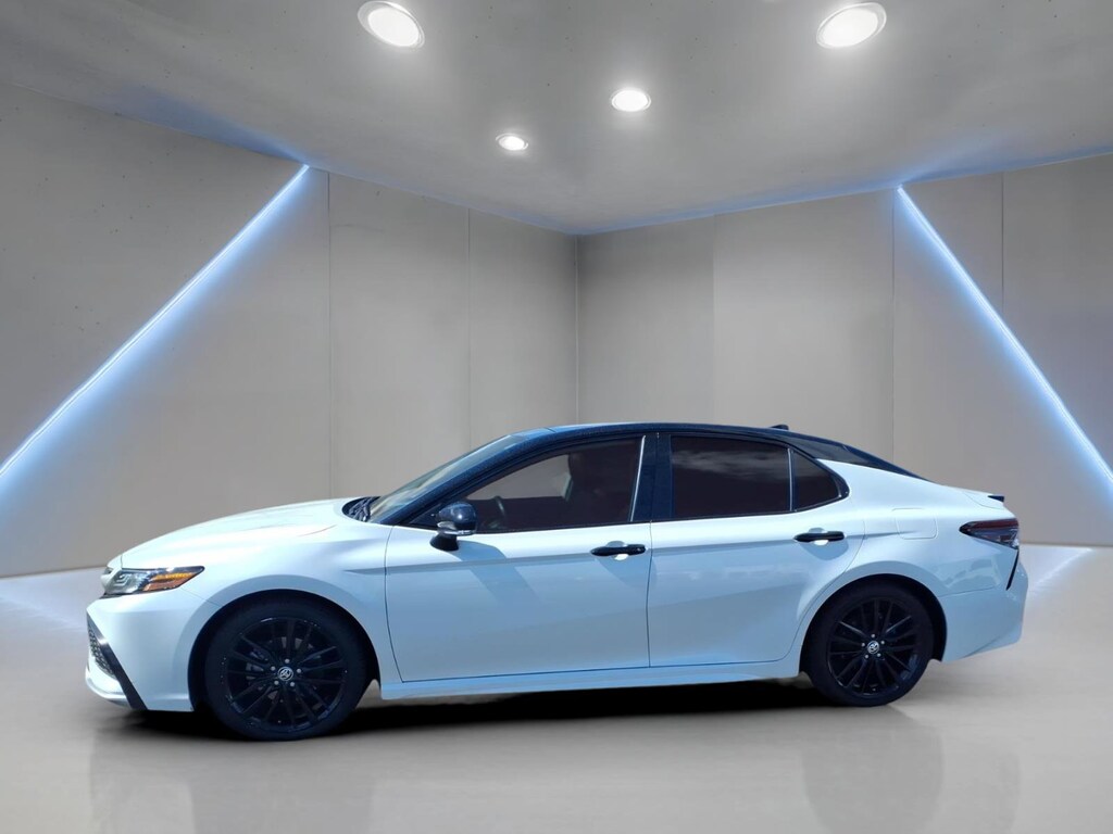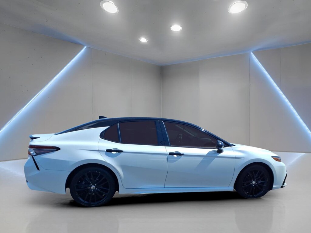 The exterior of this Camry XSE is finished in a stunning Off-white color, complemented by the Midnight Black Metallic roof, rear spoiler, and mirror housings, creating a truly distinctive and eye-catching appearance. The 19-inch Black Machined-Finish Alloy wheels further enhance the vehicle's sporty and premium aesthetic.